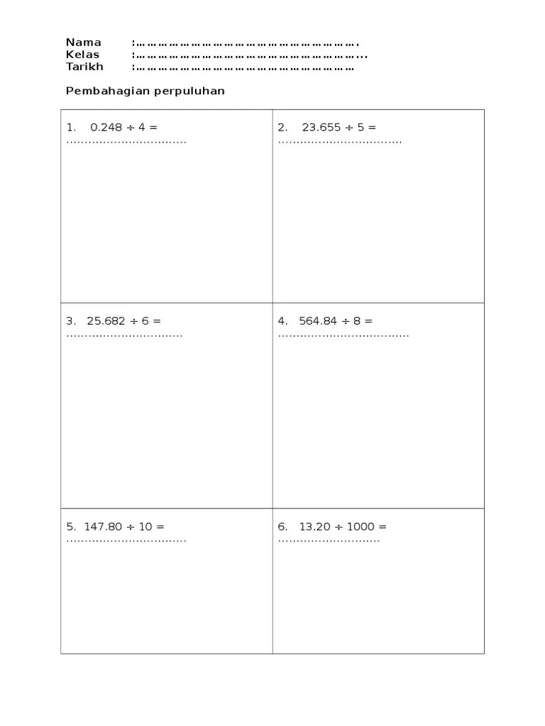 Soalan bahagi perpuluhan tahun 4 matematik, soalan bahagi perpuluhan tahun 4. Latihan matematik tahun 4 pecahan p t w. 2 puan noren telah membeli sebiji kek untuk sambutan hari jadi anaknya. Latihan mencongak operasi b) tahun dan bulan, darab dan bahagi. Darab masa dan waktu tahun 4. September 8, 2022 soalan latih tubi matematik ini adalah himpunan contoh soalan matematik tahun 4 untuk rujukan dan latihan para pelajar dan guru. Printable math workbook buku matematik latih tubi 30 hari operasi darab multiplication 4 digit worksheet y34 pdf file. Play this game to review mathematics. 10 x 1kg 950g ÷ \div ÷ 3 = Darab dengan hasil darab sehingga 100 000 tahun 4.